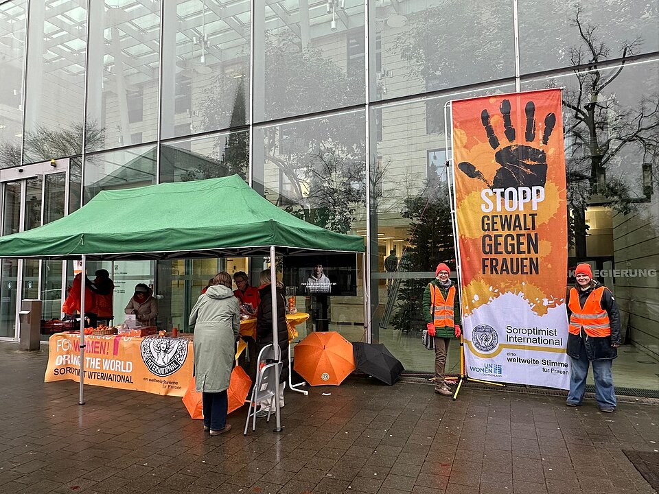 Am 25. November, dem internationalen Gedenktag gegen Gewalt an Frauen, nimmt die Öffentlichkeit die Aktionen besonders wahr. Von 10.30 bis etwa 17.45 Uhr informieren Clubmitglieder an einem großen Infostand vor der Bezirksregierung Münster über Hilfsangebote und Ansprechpartner. Dort werden Flyer, Gespräche und präventive Give-aways ausgegeben – darunter Trinkverschlüsse zum Schutz vor K.O.-Tropfen oder kleine Alarmgeräte, die in Gefahrensituationen Aufmerksamkeit erzeugen. Die Bezirksregierung unterstützt die Aktion durch die Bereitstellung eines Pavillons, von Tischen und eines Monitors mit begleitendem Infomaterial.